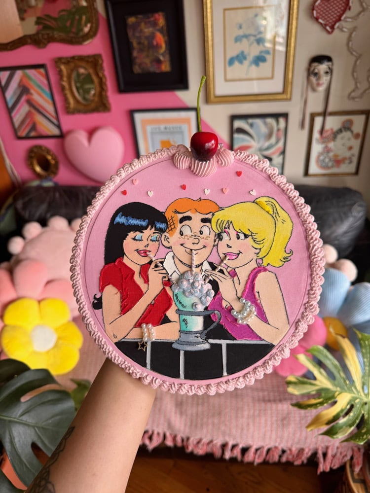 this piece is embroidered and painted, all by hand. their clothes use scrap fabric, their eyes are resin set, they have added jewellery, heart sprinkle decorations and the sides are piped with spackle and topped with a faux cherry. 💕
