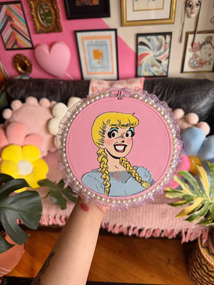 this piece is embroidered and painted, all by hand. her sweater is gingham + baby blue scrap fabric, her eyes are resin set, and the piece is finished with ruffle lace trim and faux pearls. 💕