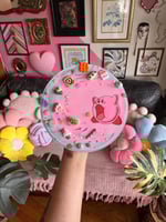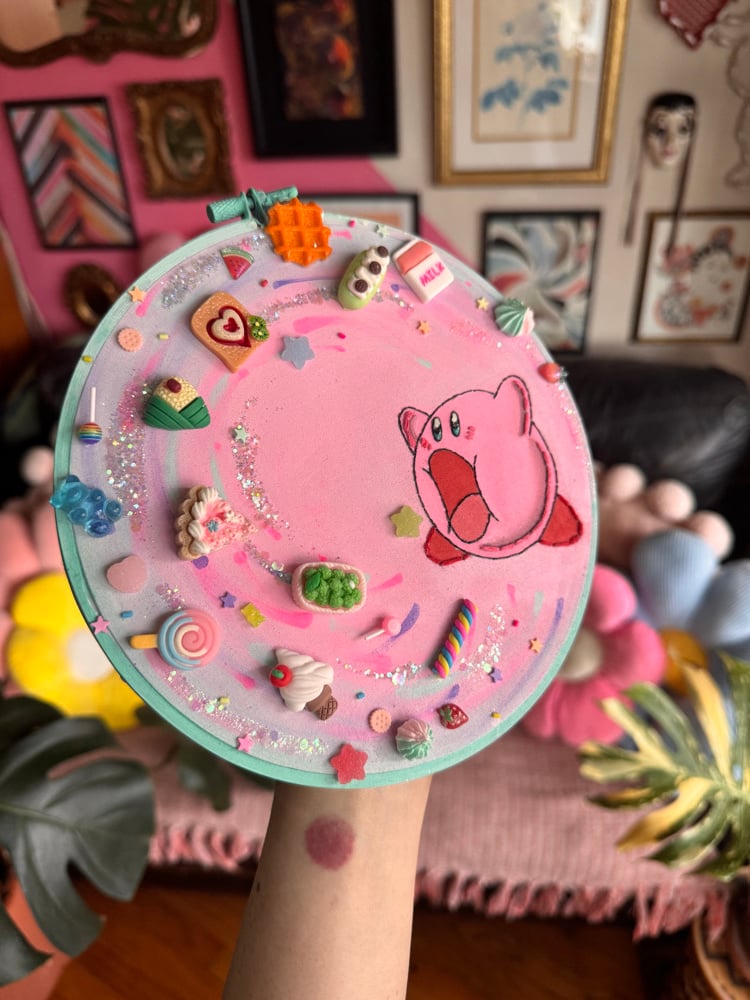this piece is embroidered and painted, all by hand. it features a bunch of food cabochons, glitter and kirby has resin set eyes. 💕