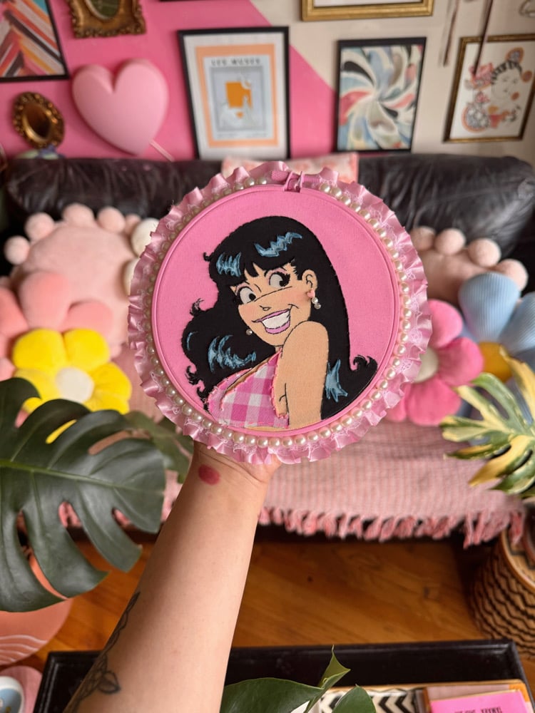this piece is embroidered and painted, all by hand. her bikini is gingham scrap fabric, her eyes are resin set, she has real jewel earrings, and the piece is finished with ruffle lace trim and faux pearls. 💕