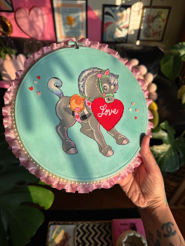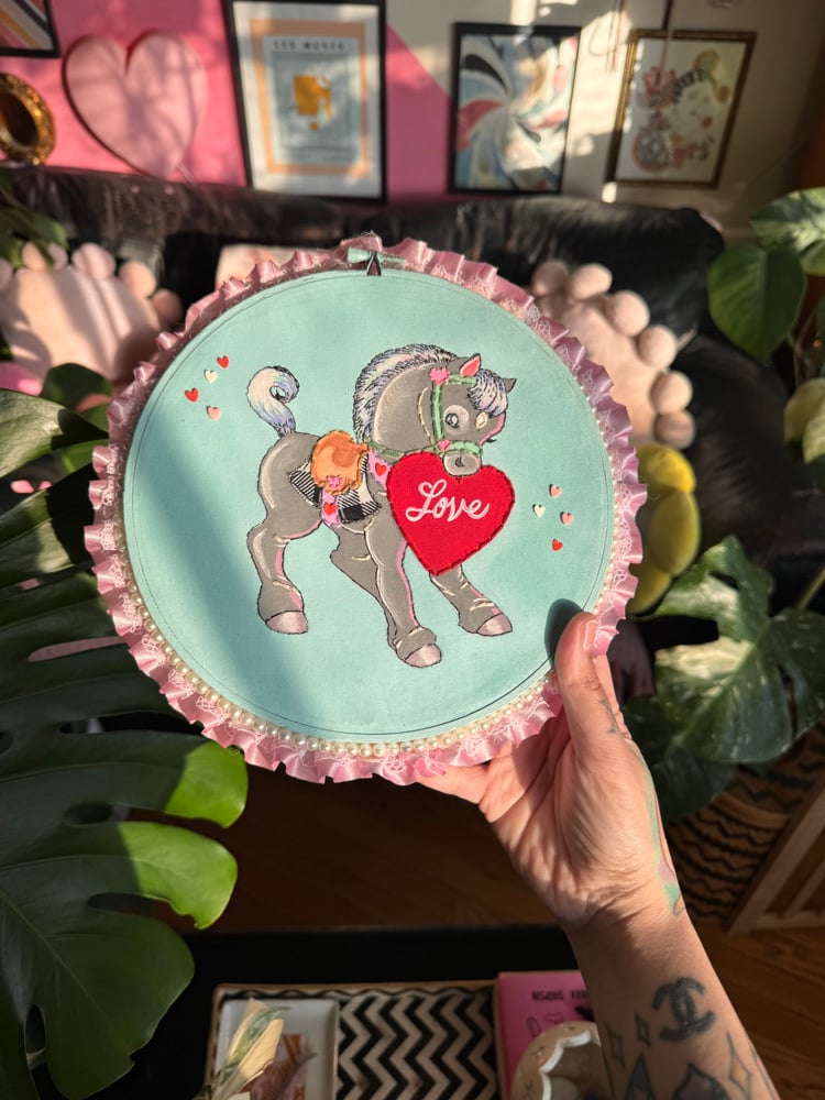 this 8” hoop is completely hand embroidered + painted by me. it uses scrap fabric, paint, resin and resin heart sprinkles. the sides are set with lace trim and faux pearls.